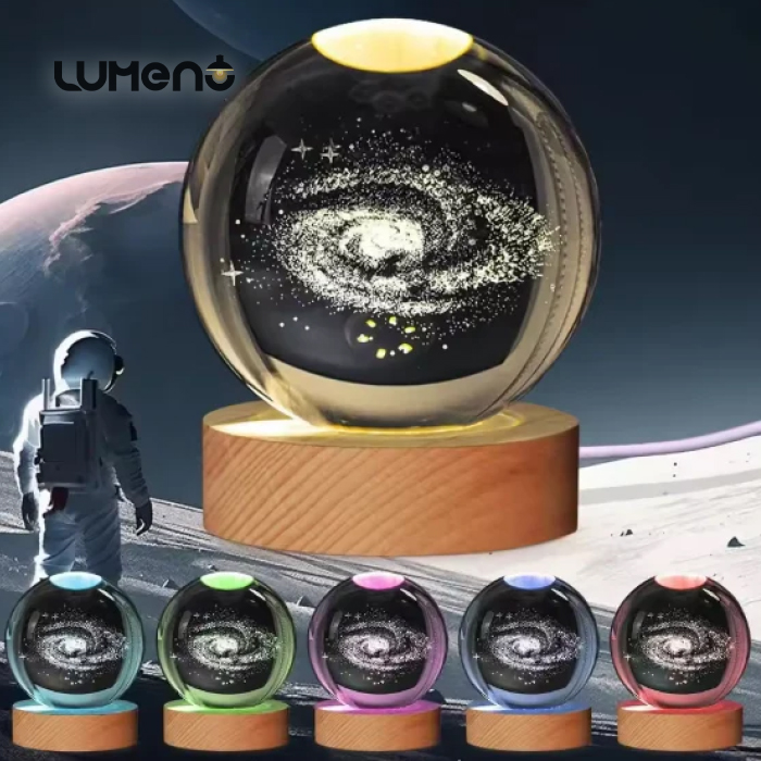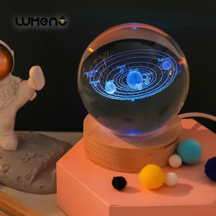 3D Crystal Galaxy Ball Night Lamp with Wooden Base (6cm) – Solar System – Moon – Earth – Heart Cloud – Crescent -Moon Walk